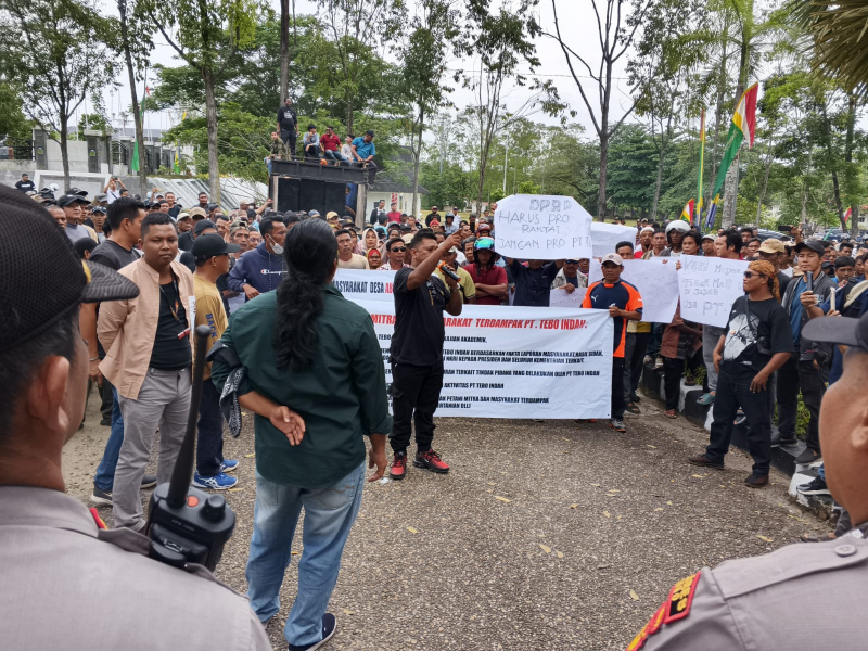 Radarjambi.co.id-TEBO Ratusan warga 10 Desa di Kecamatan Tebo Tengah dan Kecamatan Tengah Ikut yang berada dalam kawasan Hak Guna Usaha (HGU) PT Tebo Indah (TI), Selasa (28/10) menggeruduk kantor DPRD Tebo.