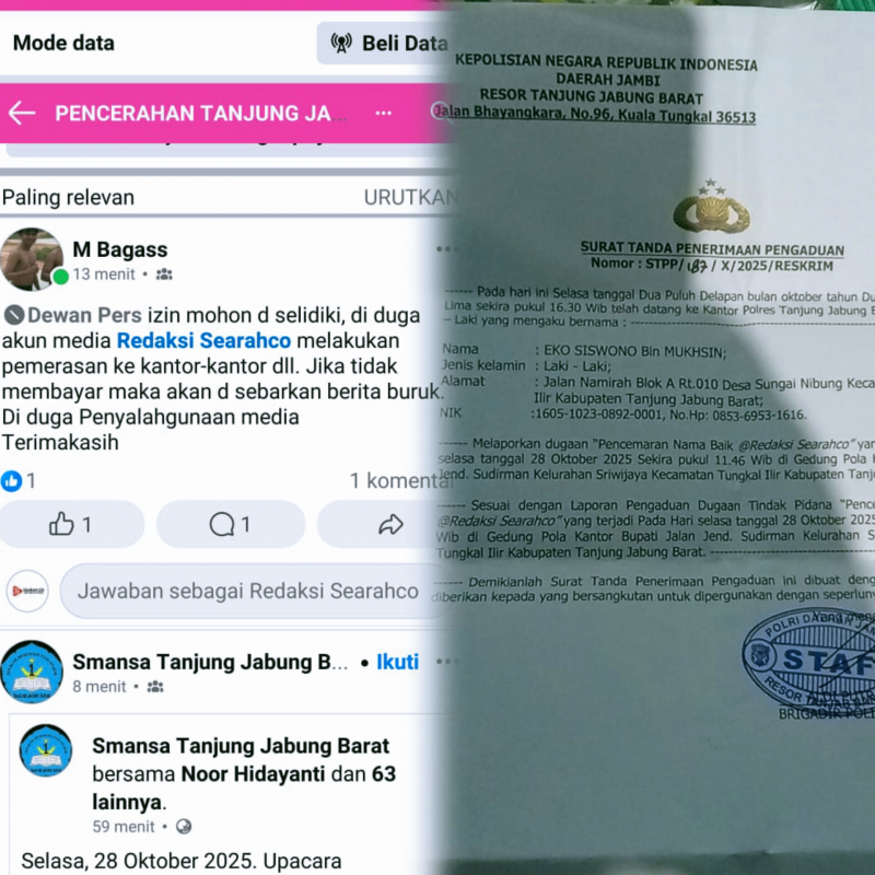 Ia menyebutkan laporan dilakukan pertama kepada akun @m bagass di grup Facebook Tanjung Jabung Barat dengan unggahan yang menyebutkan "Dewan pers izin mohon d selidiki, d diduga akun media @redaksi searahco melakukan pemerasan ke kantor-kantor dll. Jika tidak membayar maka akan disebarkan berita buruk. Diduga penyalah gunaan media terimakasih.," tulis akun @M Bagass.