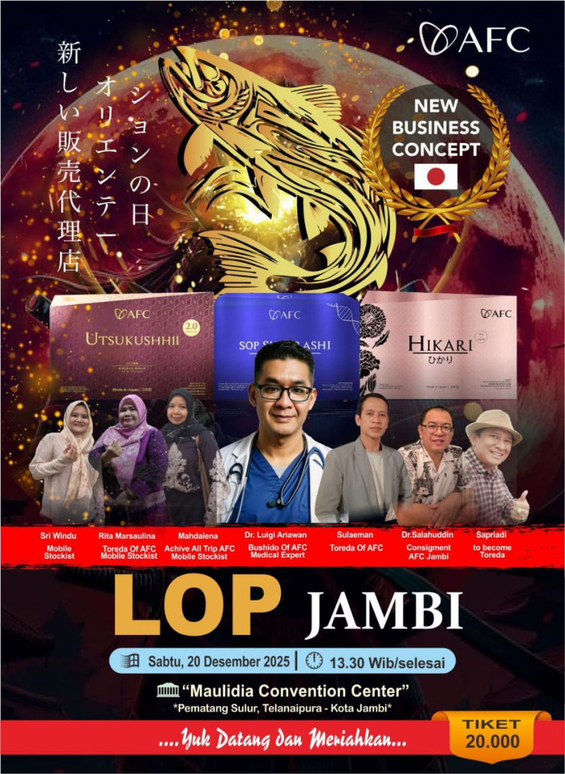 "Untuk teman - teman di Jambi setelah beberapa kali kita mengadakan acara live opportunity preview AFC Jepang maka fi Tanggal 20 Desember ini kita akan mengadakan lagi LOP AFC yang akan saya bawakan langsung untuk memberikan Edukasi berita baik tentang peluang bisnis kesehatan," terang dr Luigi