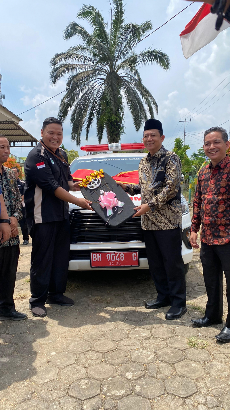 Bupati Muaro Jambi Dr. Bambang Bayu Suseno,SP.MM.M.Si didampingi Ketua TP PKK Ririn Novianty,SE, Kepala Dinas Kesehatan Dr. Aang Hambali menyerahkan langsung 1 unit mobil ambulance kepada Puskesmas Tanjung untuk mendukung pelayanan Puskesmas tersebut.
