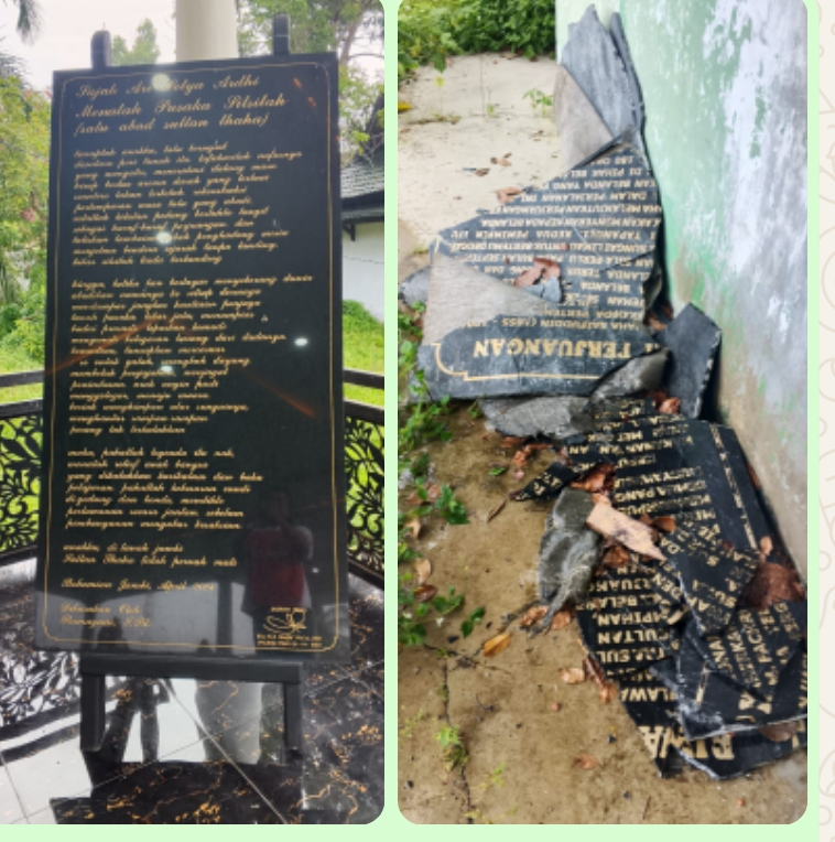 Sangat disayangkan tumpukan pecahan prasasti yang menceritakan siapa Sultan Thaha Saefuddin dan perjuangannya dalam melawan penjajah Belanda kondisinya pecah berserakan.