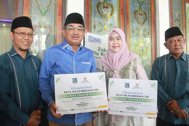 RADARJAMBI.CO.ID,TANJABBAR – Bupati Tanjung Jabung Barat, Drs. H. Anwar Sadat, M.Ag., bersama Ketua TP-PKK Tanjab Barat, Hj. Fadhilah Sadat, S.H., memimpin aksi penyerahan zakat harta dan penghasilan melalui Badan Amil Zakat Nasional (Baznas) Tanjab Barat. Kegiatan bertajuk "Pemerintah Kabupaten Tanjung Jabung Barat Berzakat" yang berlangsung di Rumah Dinas Jabatan Bupati, Minggu (8/3).